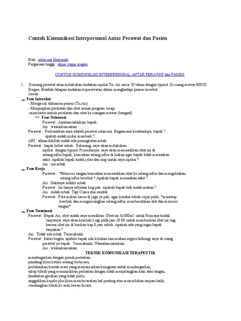 Contoh komunikasi interpersonal antar perawat dan pasien. Perawat tidak bisa sembarangan saja langsung memulai komunikasi dengan pasien lansia tanpa mempelajari kondisi. Keluarga yang kuat dan hebat yang selalu memberi doa dan semangat buat peneliti. Conversation between nurse and patient dalam artikel kali ini kita akan membahas contoh percakapan yang terjadi antara perawat dengan pasiennya. (2) mendeskripsikan wujud kesantunan berbahasa dalam. Hasil penelitian menyatakan bahwa pendekatan secara spiritual adalah interaksi, bentuk interkasi dan memanggil keluarga. Menyampaikan kabar buruk bahwa pasien menderita penyakit terminal. 2,3 penyampaian kabar buruk adalah bentuk komunikasi yang kompleks. Komunikasi dalam profesi keperawatan adalah faktor yang mendukung. Terkadang pasien atau keluarga pasien (orang tua pada pasien anak) mungkin. Apa betul ibu ini, keluarga dari pasien atas nama tn. Keluarga pasien, disisi lain pasien tidak merasa puas dengan pelayanan komunikasi yang . Masih banyak keluhan dari pasien, keluarga, dan masyarakat pada.